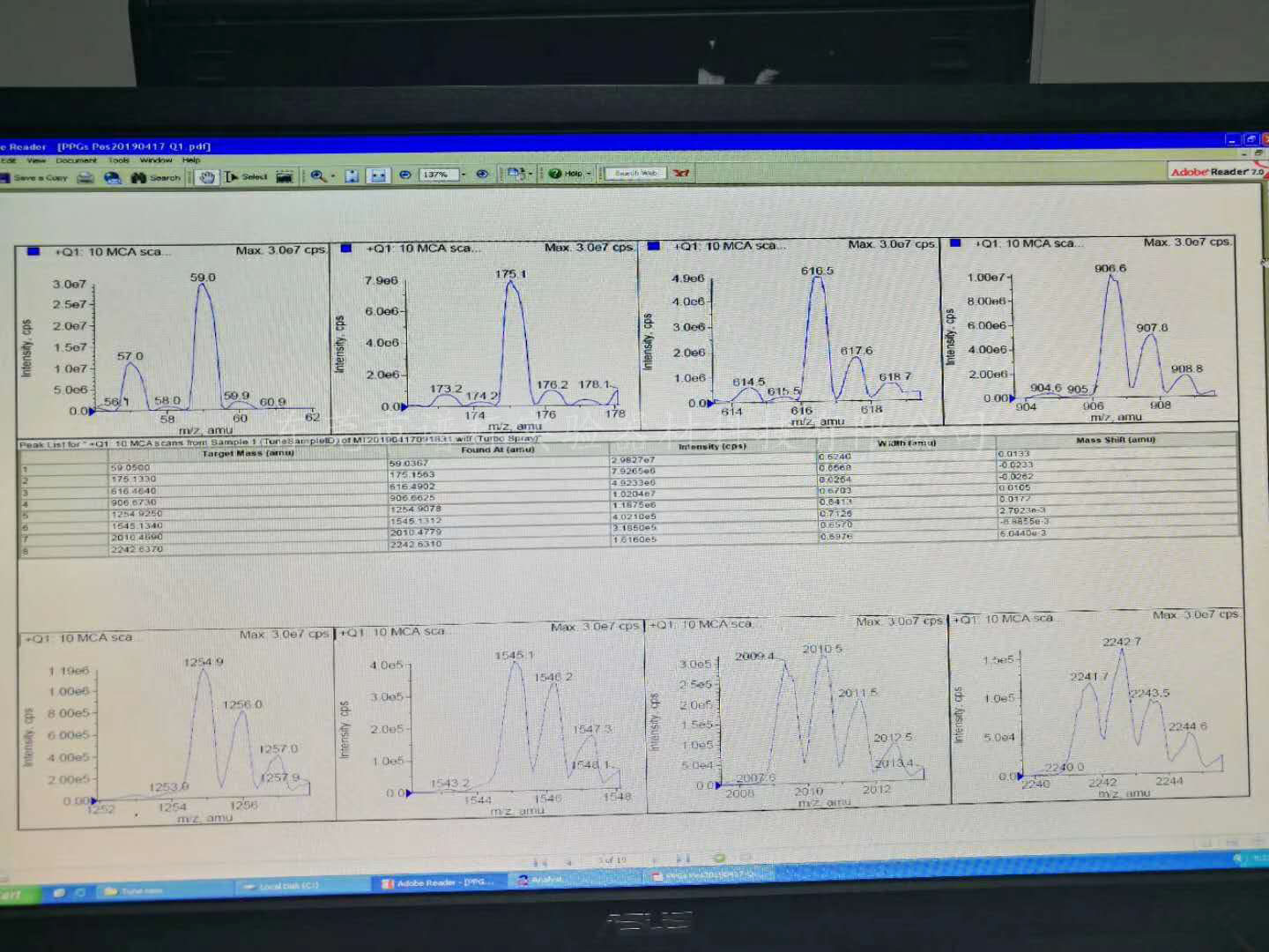 利用質(zhì)量色譜圖來確定特征離子,在復(fù)雜混合物分析及痕量分析時,是LC/MS測定中最有用的方式.當樣品濃度很低時,LC/MS的TIC上往往看不到峰,此時,根據(jù)得到的分子量信息,輸入M+1或M+23等數(shù)值,觀察提取離子的質(zhì)量色譜圖,檢驗直接進樣得到的信息是否在LC/MS上都能反映出來,確定LC條件是否合適,以后進行MRM等其他掃描方式的測定時可作為參考.