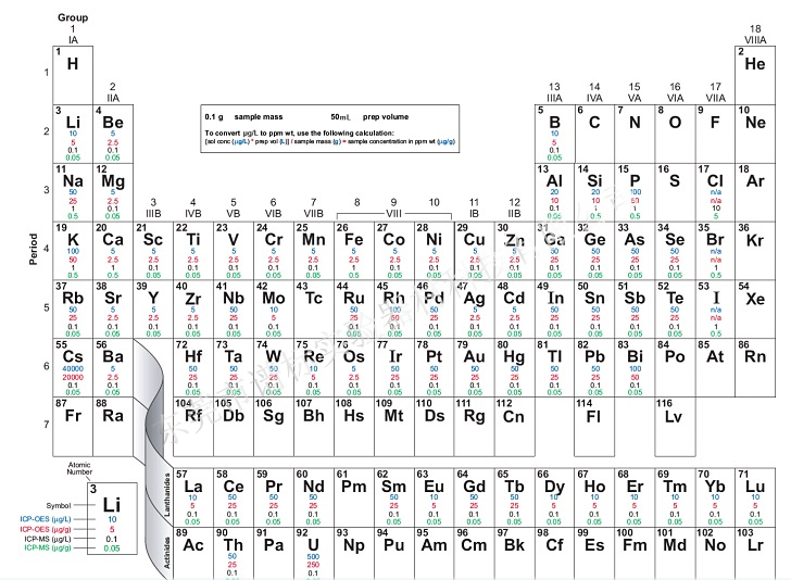 根據(jù)檢測(cè)器的不同分為ICP一OES (電感耦合等離子發(fā)射光譜儀,也稱(chēng)ICP-AES )和ICP-MS (電感耦合等離子質(zhì)譜儀)。兩者均能測(cè)元素周期表中的絕大部分元素,但能測(cè)得元素稍微有異,檢測(cè)能力上后者要比前者高。因?yàn)镮CP光源具有良好的原子化、激發(fā)和電離能力,所以它具有很好的檢出限。對(duì)于多數(shù)元素,其檢出限一般為0.1 ~ 100ng/ml ,可以同時(shí)測(cè)試多種元素,靈敏度高,檢測(cè)限低,測(cè)試范圍寬(低含量成分和高含量成分能夠同時(shí)測(cè)試)。電感耦合等離子體ICP-MS和ICP-OES的分析檢測(cè)極限有什么不同?