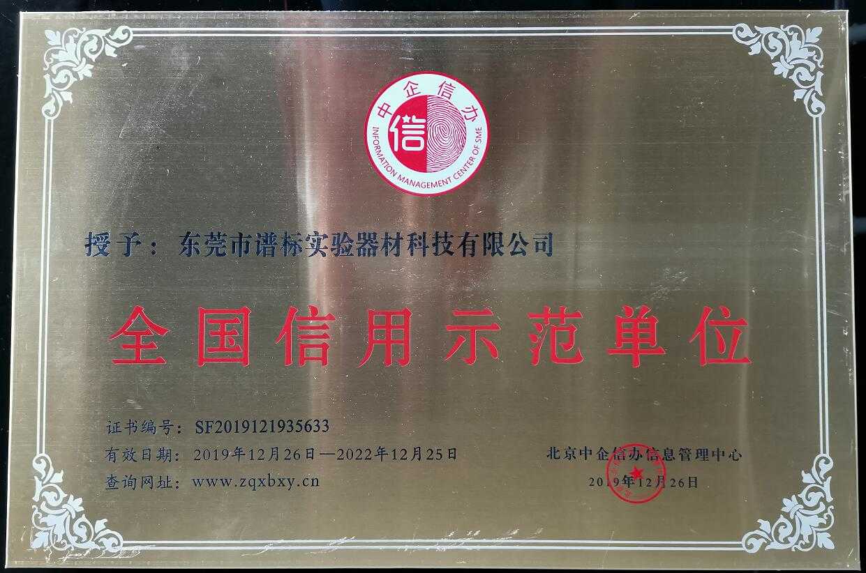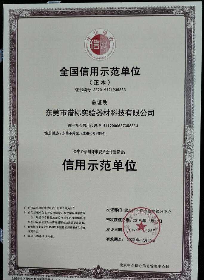 在發(fā)展中求生存,不斷完善,以良好信譽和科學的管理促進企業(yè)迅速發(fā)展2020年1月6日,中企信辦經(jīng)三次監(jiān)審后授予我司東莞譜標實驗器材科技有限公司為“ 全國信用示范單位 ”,頒發(fā)了“全國信用示范證書”、評定符合“信用示范單位”,有效期三年。