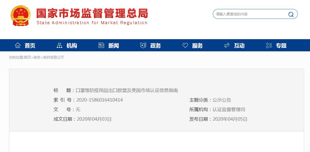 4月5日國家市場監(jiān)督管管理總局網(wǎng)站發(fā)布《口罩等防疫用品出口歐盟及美國市場認(rèn)證信息指南》。具體內(nèi)容參考如下: