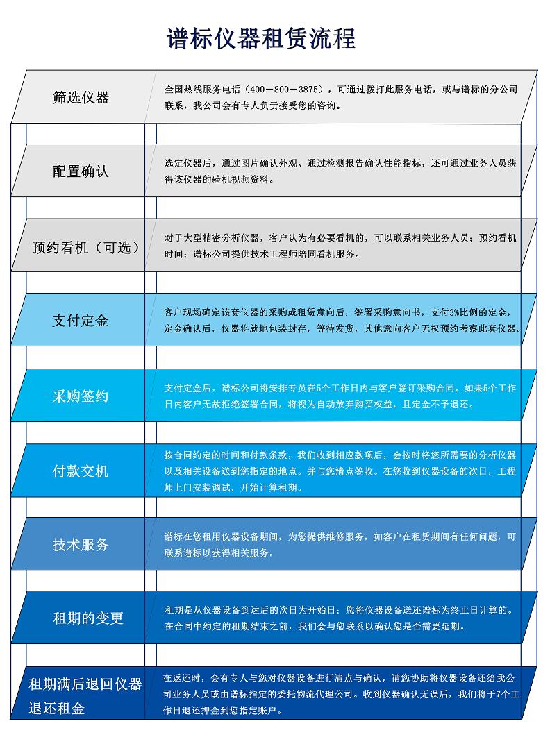 在發(fā)展中求生存,不斷完善,以良好信譽和科學的管理促進企業(yè)迅速發(fā)展2020年7月14日譜標科技發(fā)布儀器租賃流程,讓您一目了然了解我們儀器租賃的快速操作和全套服務流程。