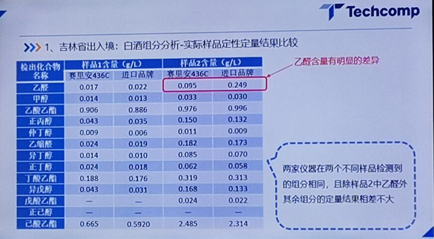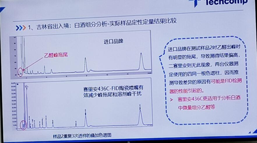 實際樣品定性定量分析白酒結(jié)果:436G有效解決了乙醛拖尾現(xiàn)象,436C-FID陶瓷噴嘴減少拖尾和溶解峰干擾。