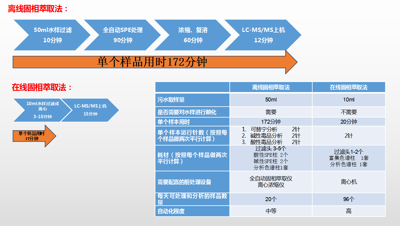 在線固相萃取法相較于離線固相萃取法,具有明顯的方法學優(yōu)勢,樣本檢測耗時只有離線法的十分之一,檢測成本只有離線法的十分之一,每日檢測速度是離線法的十倍。