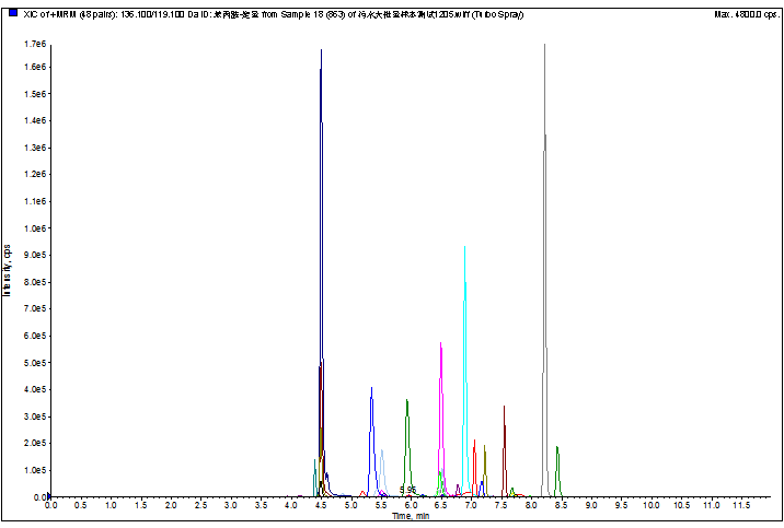 基質干擾問題:污水基質復雜,污水必須采用過0.22微米水相膜,但是可溶性基質仍然很高,污水在本方案中只經過SPE柱,僅有被富集的基質能夠進入分析柱,鹽類等基質對檢測影響不大。結合有效的切閥時間,減少了檢測受基質干擾的影響。