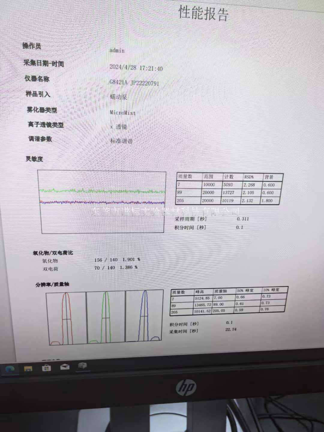工程師調(diào)諧本臺(tái)安捷倫電感耦合等離子體質(zhì)譜儀7800的性能報(bào)告靈敏度,分辨率數(shù)據(jù)如上,快速的設(shè)置和簡(jiǎn)化的分析,從而節(jié)省了時(shí)間,能使您的實(shí)驗(yàn)室輕松獲得出色的結(jié)果