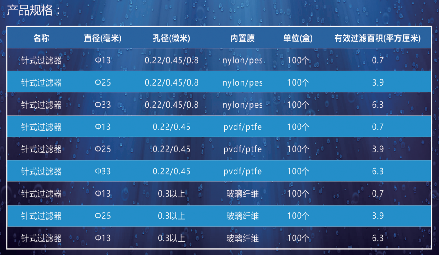 直徑:13mm;孔徑:0.45μm;濾膜材料:PTFE疏水(聚四氟乙烯)
