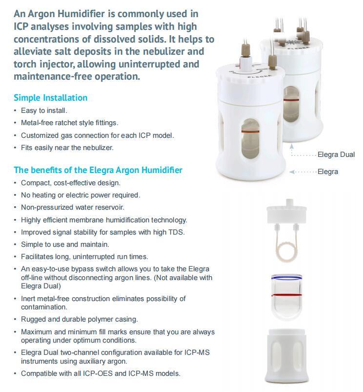 氬氣加濕器通常用于含有高濃度溶解固體的樣品的ICP分析。它有助于減輕霧化器和火炬注射器中的鹽沉積,允許不間斷和免維護(hù)的操作。