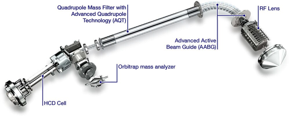 HCD 碰撞室:離子經(jīng)過充滿氮氣的 C 形離子阱進入該多級碰撞室并進行裂解。在此之后,HCD 電壓升高,離子返回 C 形離子阱,準(zhǔn)備注入 Orbitrap 以供檢測。